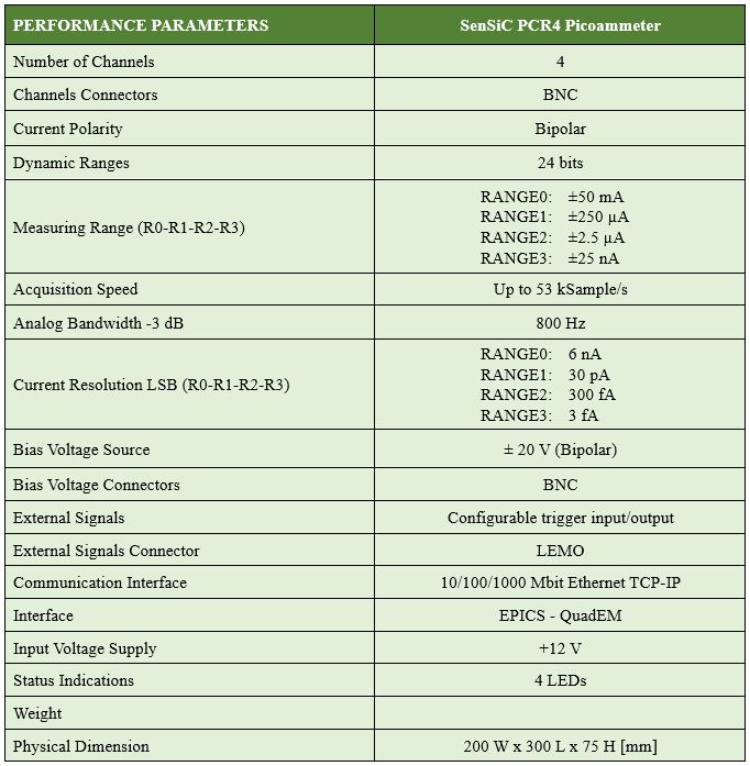 The PCR4 picoammeter by SenSiC is a 4-channel, 24-bit resolution, wide-bandwidth, wide input dynamic range picoammeter with an integrated bias source. Standard configuration being ± 20 V, different ranges on request. The device is composed of a specially designed transimpedance input stage for current sensing combined with analog signal conditioning and filtering stages making use of state-of-the-art electronics.