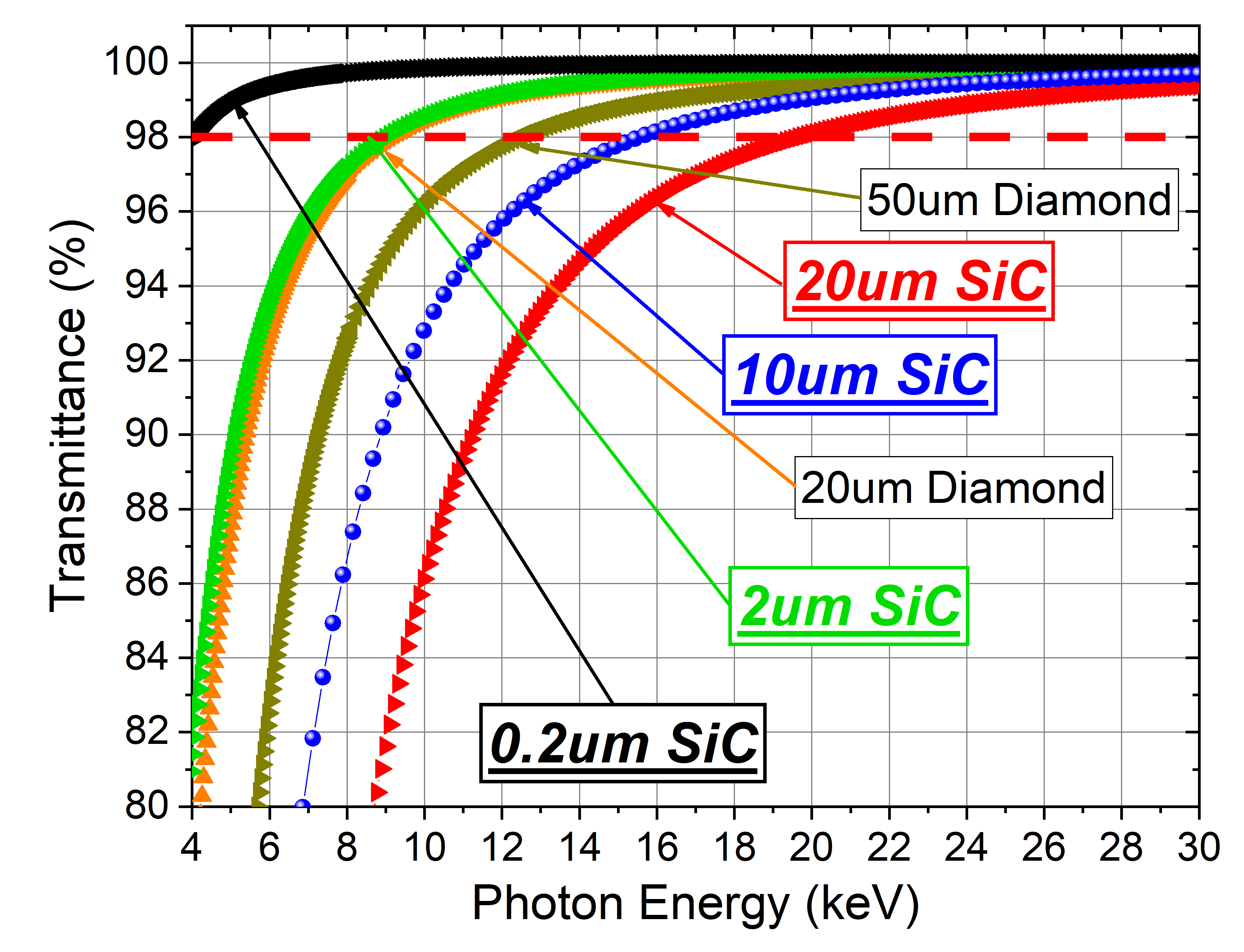 Fig.1 Transmittance of SiC sensors for different thicknesses. Also diamond commercial XBPM are included for comparison